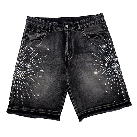 Pantalones cortos de mezclilla lavados con ácido desgastados medios personalizados para hombre, diseño de diamantes de imitación Vintage, holgado, dobladillo crudo, ropa de calle Hip Hop para