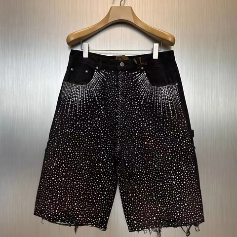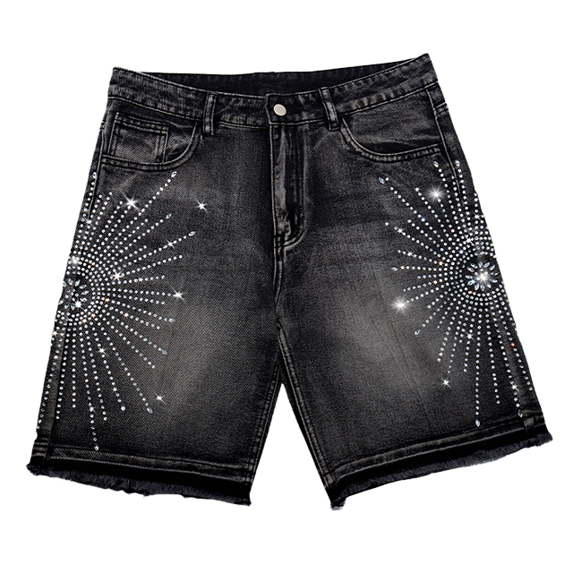 מותאם אישית גברים באמצע במצוקה חומצה כביסה ג 'ינס מכנסיים קצרים כל-rhinstone עיצוב וינטג' בייגי שולי גלם היפ הופ